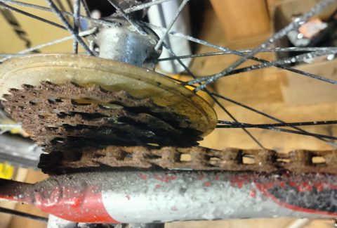 Rower nie zabezpieczony na zimę troszkę podrdzewiał. Zadanie dla serwisu przegląd, wymiana uszkodzonych elementów. W tym rowerze udało się ocalić kasetę i przerzutkę oraz 1 tarczę hamulcową, wymiana łańcucha, oraz …